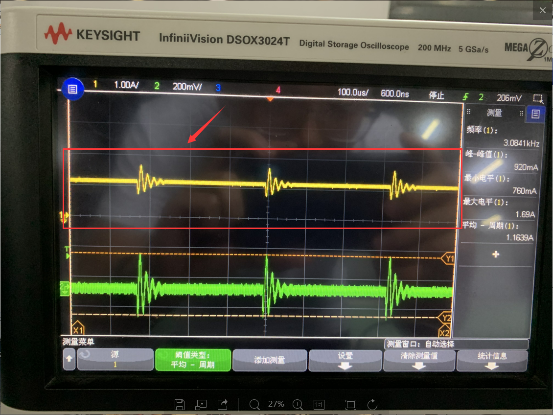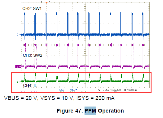 在测试板卡的充电纹波时,我发现一段时间后,电池芯片进入轻载充电模式,但是,PFM的电流波形与手册上有些不一致,如下图所示。我感觉我的板卡在电流调节的过程中出现了震荡,现在不知道问题到底出在哪里,我的电流检测布线,由于板卡的空间限制并没有走成差分线,希望给位前辈给出解答,谢谢!