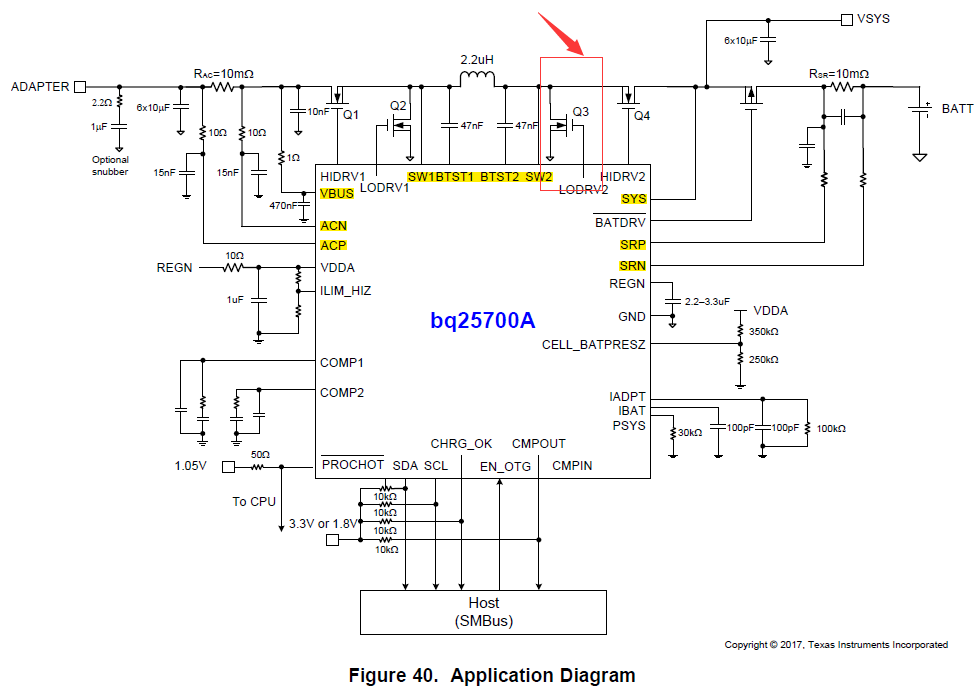 另外,在充电的过程中,BQ25700A上电之后芯片表层温度就会上升到50℃左右,layout中有散热焊盘,并在焊盘上打了9个地孔。充电过程中,如果芯片工作于buk-boost或者boost模式,如芯片手册原理图中所示的Q3 MOS管也会发热,温度基本和充电管理芯片一致。MOS管我是按照EVM中的型号选型的,所以应该不存在驱动电容过大的问题。板卡实测Q3的驱动波形,确实有些问题,大部分Q3的驱动波形仅有2.6V的高电平。
