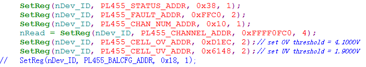你好,我有个项目在调试BQ76PL455均衡功能时,发现均衡寄存器写入无效,读取后的返回数据帧也有问题,如下图1所示,写入均衡寄存器CBENBL后,再将其读取,返回只有4个字节;图2为AFE的配置代码。可否协助分析一下,谢谢!