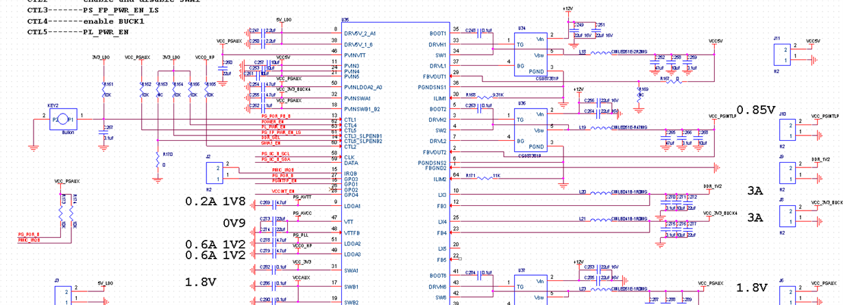 原理图如下,焊接了3块测试板都是同样的问题,仅有LDO5V和LDO3V3输出正常,BUCK1输出仅0.4V左右