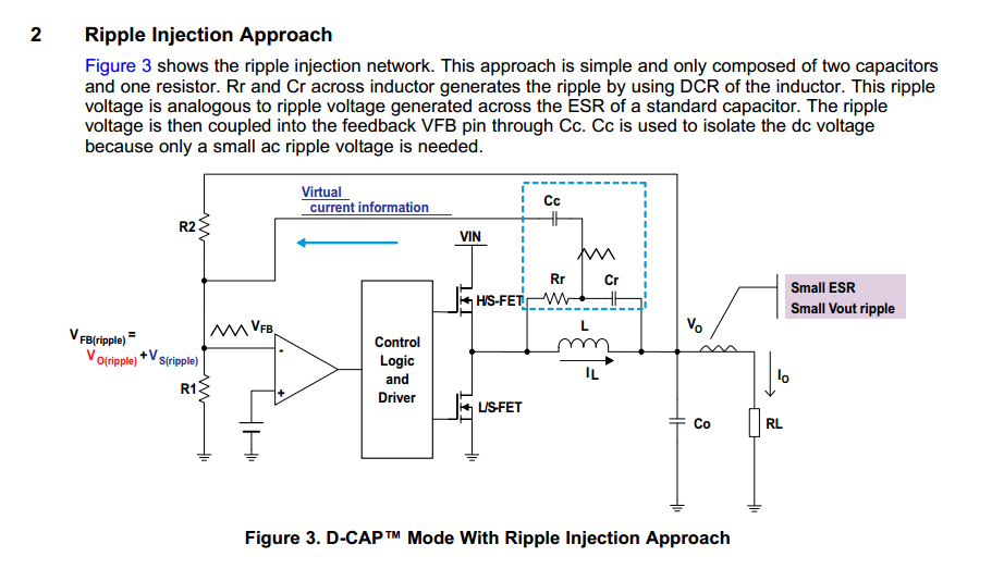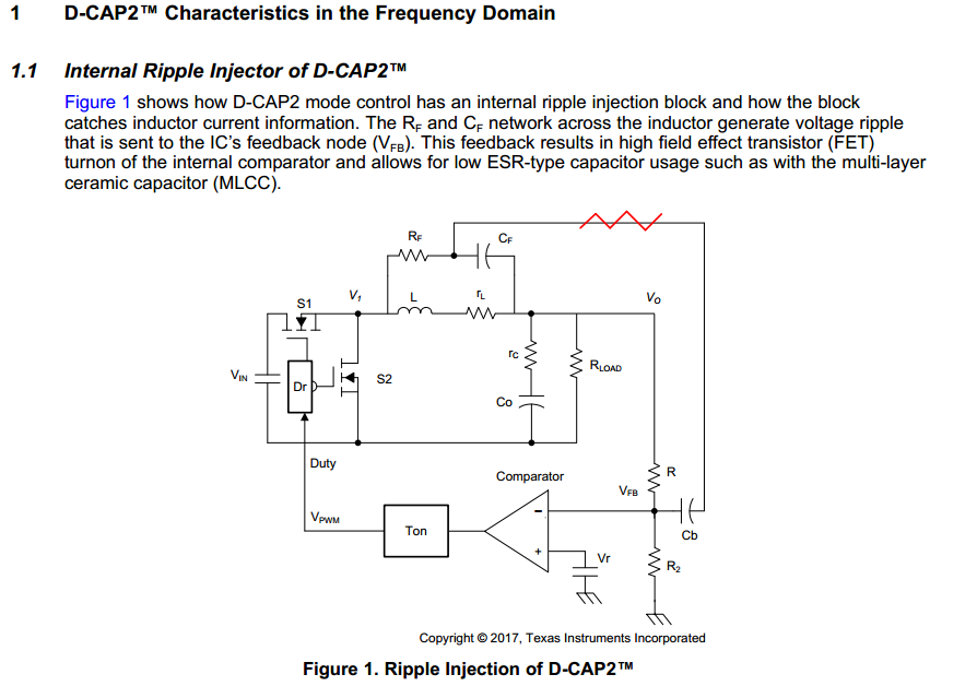 以上两幅图分别来自TI的SLVA453和SLVA905,之前我理解的D-CAP2是在D-CAP1的基础上发展而来,D-CAP2可以使ESR小的陶瓷电容然后增加内部ramp电路到FB,但是以上这两张图让我很疑惑,这两种模式有啥区别?