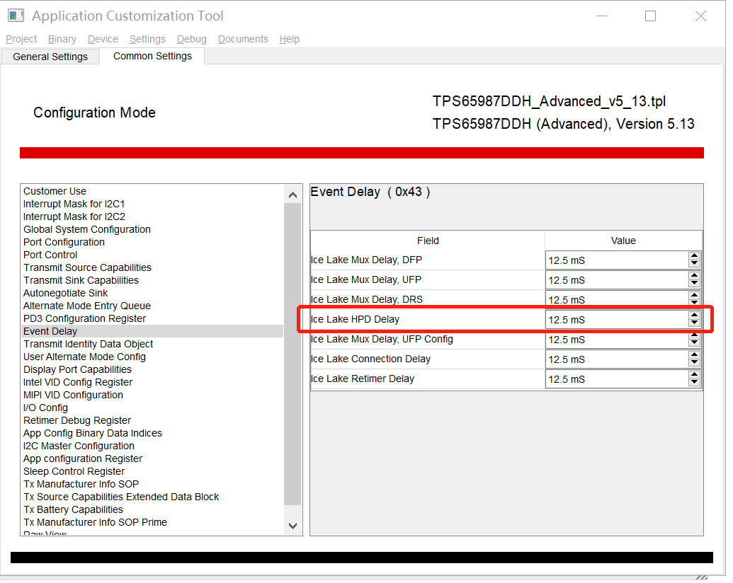 请问TPS65987D能否设置HPD延时,软件这个界面Ice Lake HPD Delay是什么意思,是否就是设置HPD延时的界面