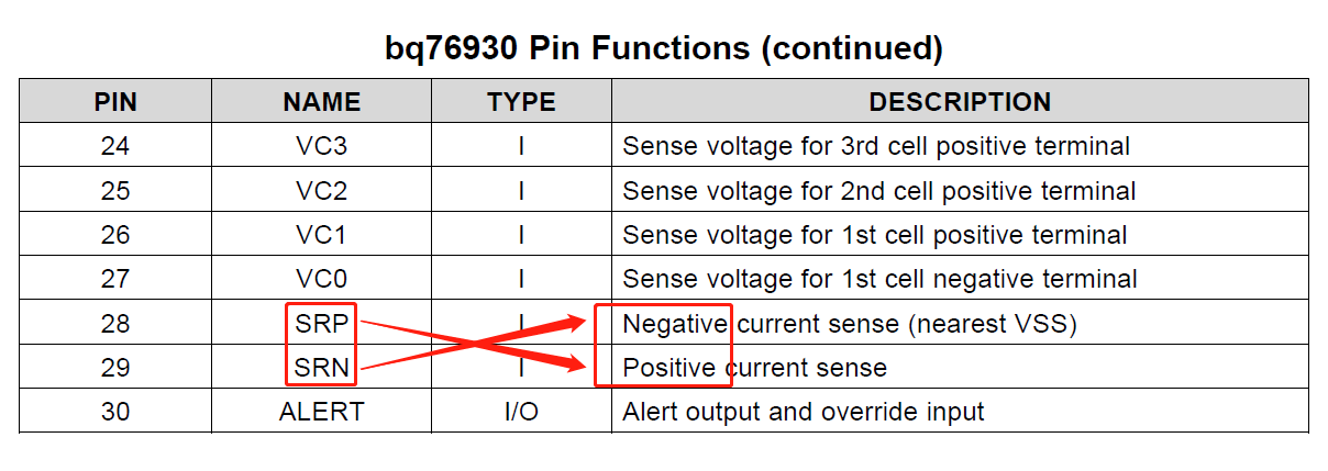 请问BQ76930 datasheet上关于电流信号输入引脚SRP和SRN的描述是不是刚好搞反了呢(如下图所示),按英文缩写来理解的话,SRP应该是