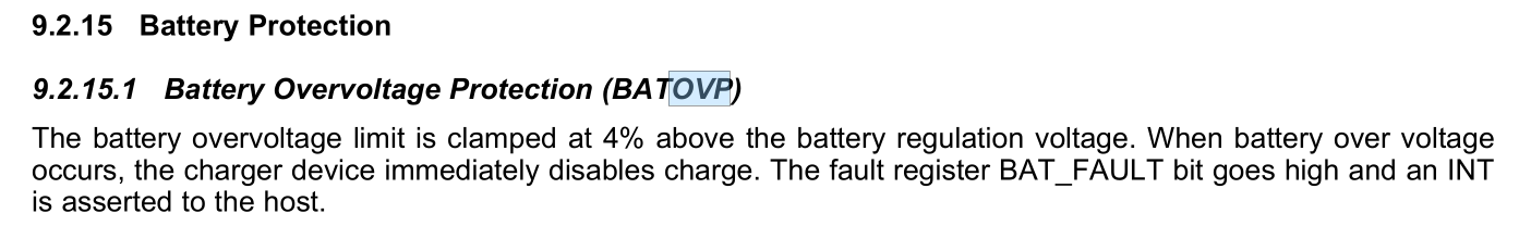 SYS OVP : The charger device clamps the system voltage during load transient so that the components connect to system would not be damaged due to high voltage. When SYSOVP is detected, the converter stops immediately to clamp the overshoot, but the switching will resume immediately once SYSOVP condition is removed. The SYSOVP thresholds are fixed internally and can't be changed by user. The SYSOVP trigger threshold and recovery threshold are both higher than VBAT.