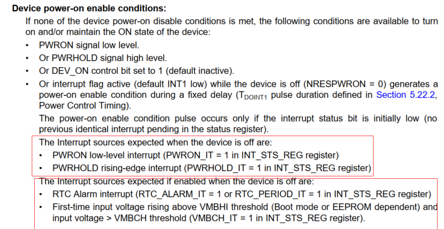 如下图所示,通过对下面开机中断源的理解,可不可以这样做?当VCC7的输入电压为5V(其他的输入电源也采用这个5V),当输入电压大于VMBCH时就会产生上电使能中断(使得PMIC power on),如果我们把输入的5V同时也接在PWRHOLD引脚上(不采用pwron拉低的方式上电,pwron悬空)(使得PMIC保持一直输出),只要输入电压5v一上电,一段时间后PMIC是不是就可以正常工作输出电压了?这样能不能实现?