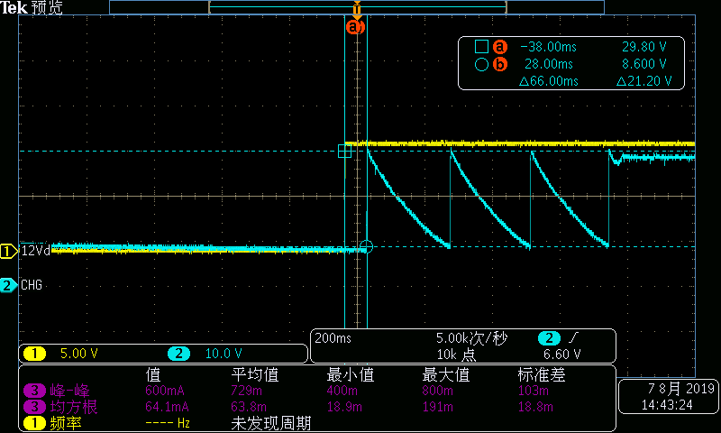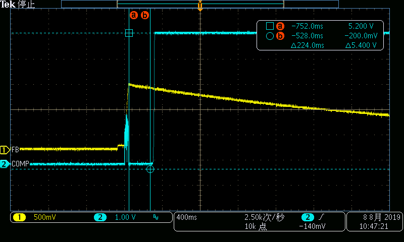 使用LM5116,发现空载时,输出电压不正常,输出电压上电过程中有多次打咯,处于空载状态,感觉好像输出电容通过Buck电感和续流二极管反灌电流,如下图: