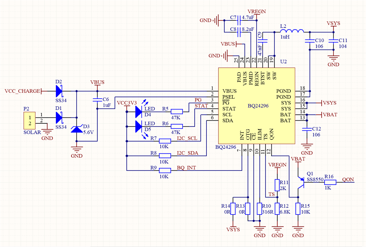 最近在使用TI 的BQ24296做电源以及电池充电管理。查阅芯片手册,发现此芯片可以让系统电压也就是VSYS保持在3.5V(默认值,可通过配置寄存器改变)以上。手册中描述的很清楚,如果电池电压低于最小系统电压的设定值,BATFET会进入LDO模式,以保持VSYS一直在最小系统电压之上,以保证整个系统的运行。但是我经过测试,发现无法实现这一功能,也就是芯片的SW脚输出的电压一直等于电池电压,寄存器配置最小系统电压为3.7V以及默认配置3.5V都试过,都不行。电池电压到3.4V时,系统电压也为3.4V,无法保持在最小系统电压之上。使用方式为禁用OTG,启用充电,VBUS输入为电源适配器。充放电都很正常,就是无法实现此功能!电路如下,还请各位能给予帮助,在此感谢!