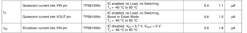 在产品设计中供电使用的是单节锂电池供,想要使电池电量完全用尽,所以加了TPS610995,该颗芯片的特性是当输入高于输出(输出是3.6v)时,输出跟随输入,此时我想了解跟随时的功耗是多少?手册里是否有列出?谢谢。