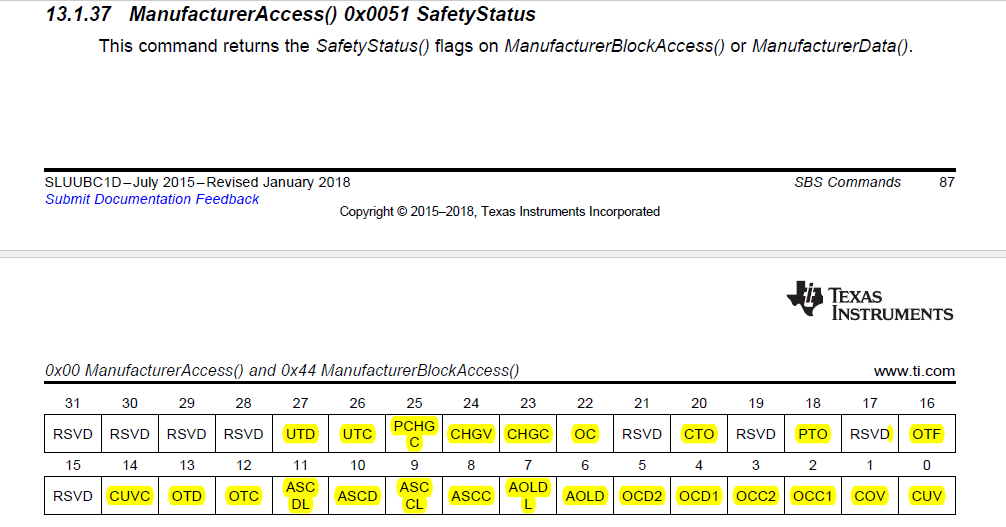 在 bq40z50-R1 Techinical Reference的2.14中,一旦发生SBS Host Wathcdog Protection保护后,会在Safty Status()中进行显示,如下图所示: