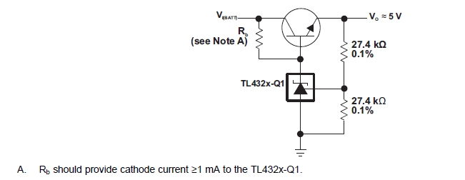 (3)根据TL432手册中相同电路,如图2所示, R1=R2=Rfb,且需要提供TL432 Imin=1 mA