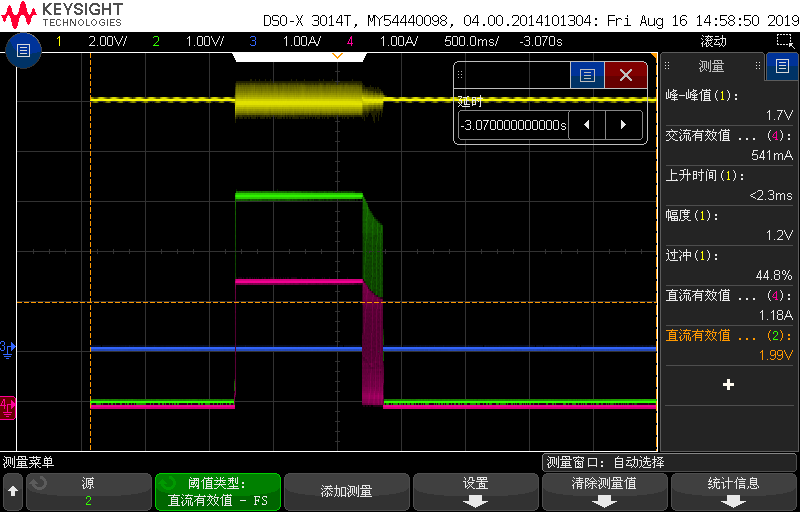 TPS54302 12V输入 ,4.2V输出,输出电流不足,测试时接电阻负载测试电流为2.46A时,器件会过流保护,关断输出,测试波形如图片,黄色为12V输入,绿色为4.2V,紫色为输出电流。