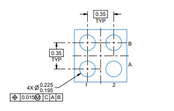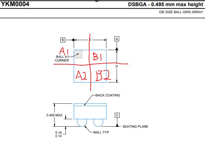 需要帮忙确认下芯片封装问题,如下是YKM的封装图,按照前面的说明,从正面看左上角应该是A1脚,正常理解左下角是A2脚,右上角是B1脚,右下角是B2脚,不知道是否正确?