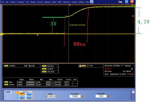 我在使用TPS386000 的时候,发现WDI信号上升沿很缓,如下图