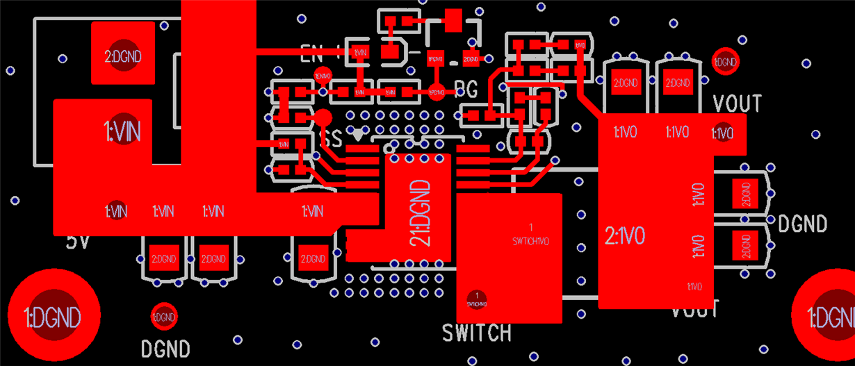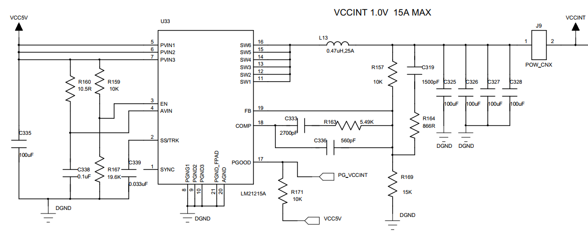 使用LM21215A芯片5V输入,1V/15A输出,问题是5颗芯片同样FB电阻时,输出电压均不一样,有大于1.2V和小于0.9V的情况。之后我又发现所有网络均有一个500KHz的噪声,包括GND、SWITCH和Vin,尝试过更换电感但没有作用。请问这个可能产生的原因,以及可行的办法。