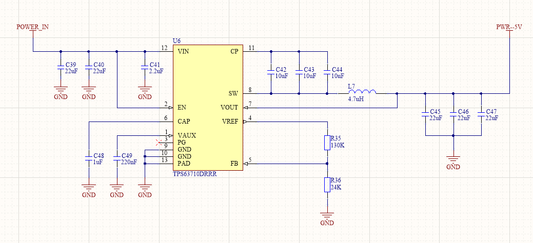 自己画的原理图和参考手册的区别是,PG悬空了,除此之外都相同。4.7uh电感选用的是cd54贴片功率电感。电阻都是精密电阻。