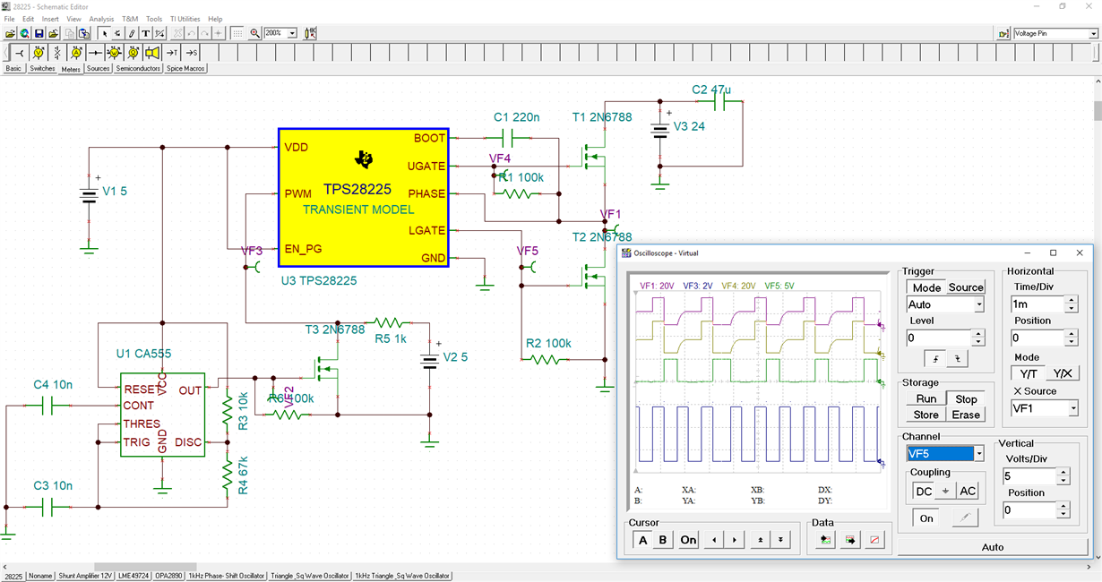 如题,TPS28225用TI-tina仿真时当占空比大于50%时,输出高边信号失真.
