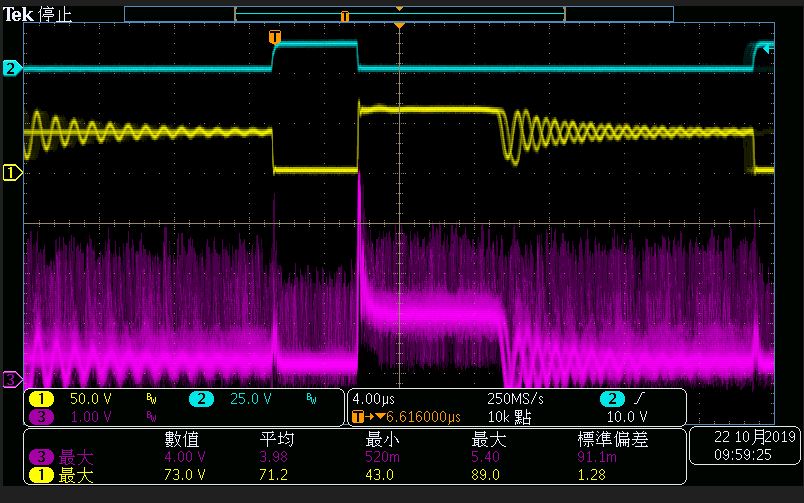 wave1.jpg拉出PWM信号,Mosfte的VDS和UCC28600的Vvop(scale是2V)。