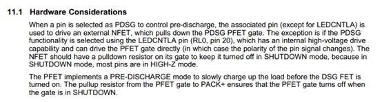 2、实际测试中,设置好PIN20为PDSG,当operation statue[PDSG]=1时,该引脚拉低;当operation statue[PDSG]=0时,万用表测得pin20输出一个稍低于PACK+的电压,请问此时这个电压是有驱动能力吗?这个电压差会不会使Q5误导通?