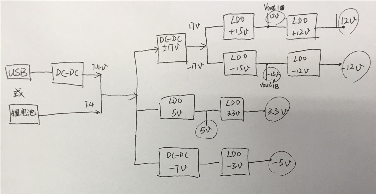 各位大佬好,诚恳的求教,目标:我现在的需求是需要将锂电池(常见的电压类型不限于7.4v),生成+-15V,+-12V,+-5V以及3.3V的直流电源;