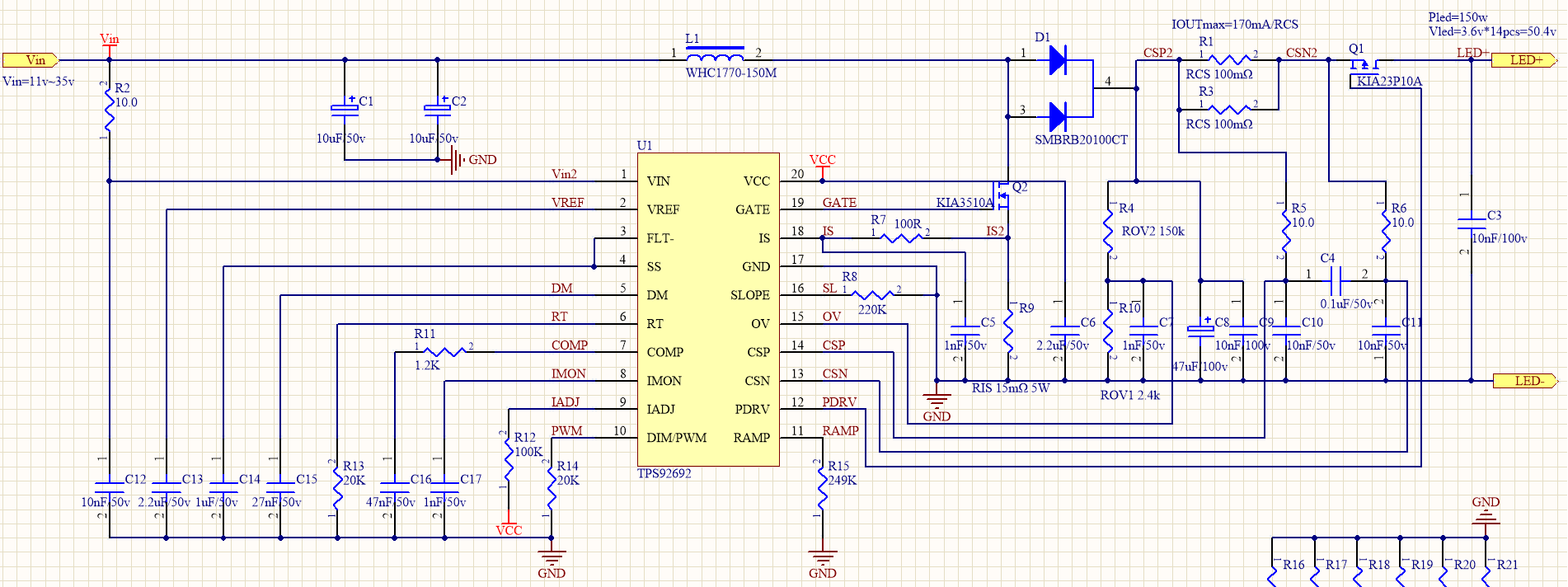 输入电压24v,电路稳定后,测得输出电压39v,测得PIN8/IMON引脚0.014v,输出电流仅20mA,LED微亮且轻微抖动。