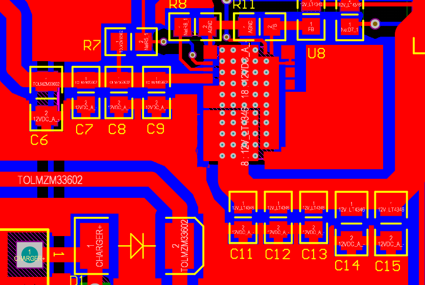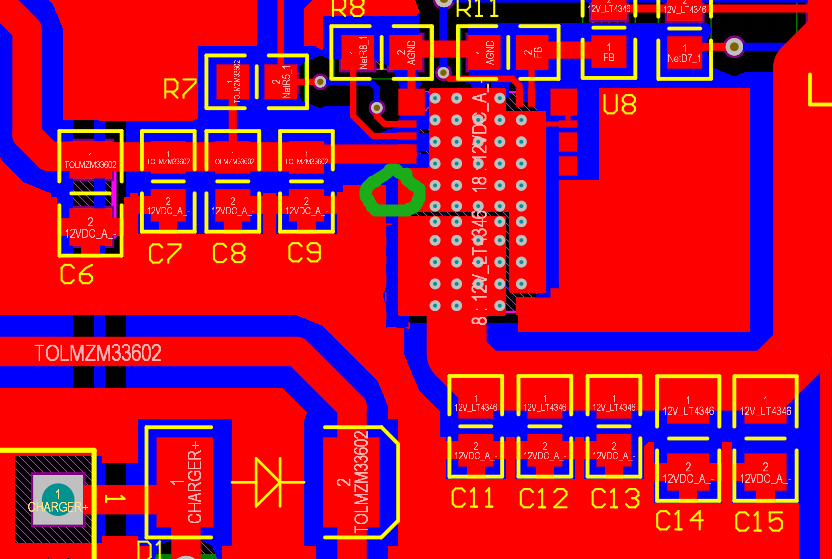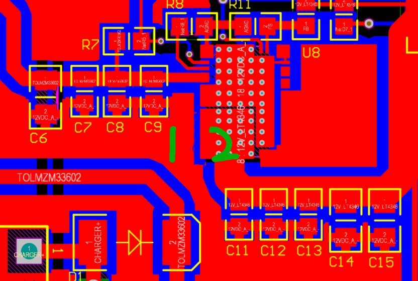 第二次布板的时候,自己自作聪明,改变了输出电容的C11-C15放置位置,如下图所示: