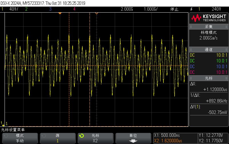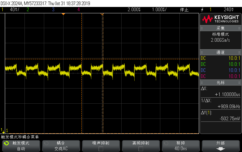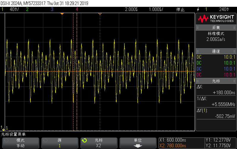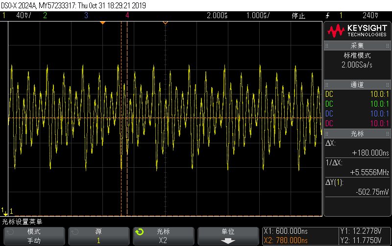 结果这个板子在测试的时候,输出电压纹波上的噪声非常大,空载就有将近200mV的噪声,噪声频率在5-6MHz,如下图所示: