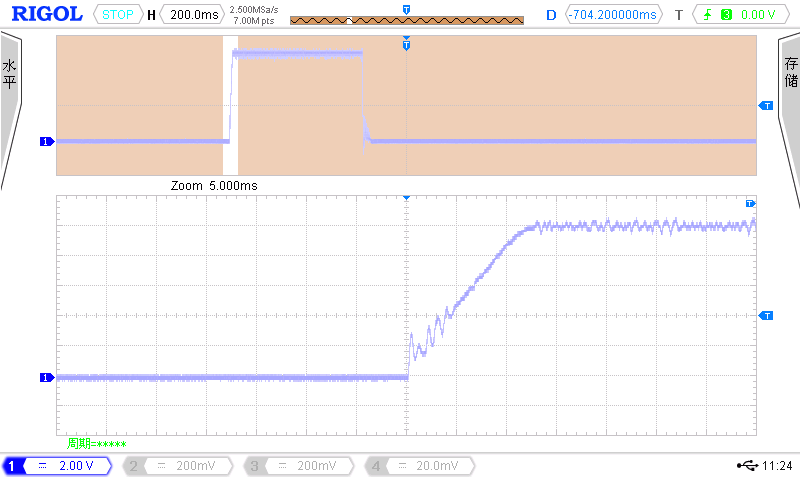 两张实测输出电压波形图,测试方法按照建议已使用地弹簧,一张是在负载20欧时的启动波形,一张是负载在8欧和18欧之间切换时的瞬态波形,可见时间尺度为ms级别,仍然能够观察到数百mv的低频纹波,电路的叫声也印证了这一点,而负载越重纹波越大,请问是电路哪里的设计问题呢?
