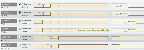 我利用WEBENCH DESIGNER给xillinx一款FPGA选择供电电源,其中fpga供电时序设置如下。最后WEBENCH DESIGNER给出电源方案,但是我看不出方案中不同电源上电顺序是怎么实现的,请高人指导一下。。多谢。。
