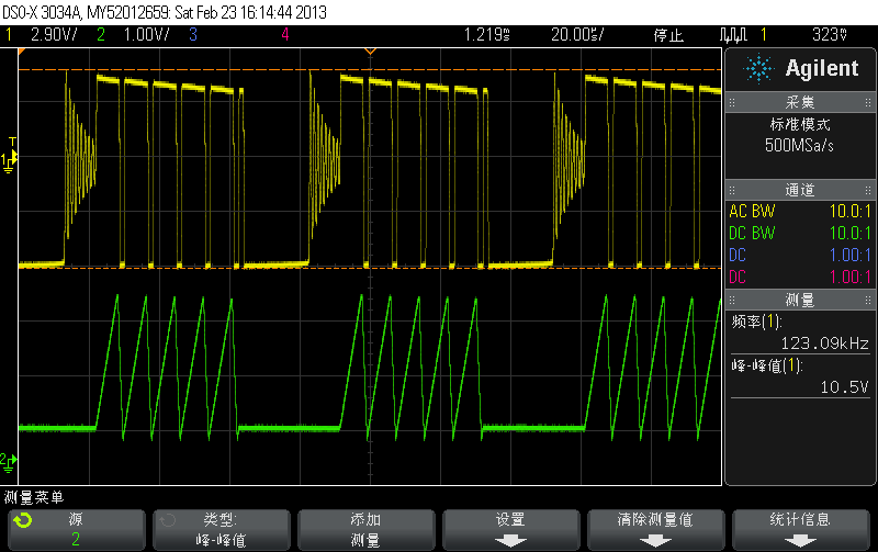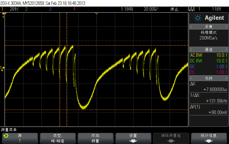 带载30mA后如下图所示,黄色为8脚波形,绿色为3脚波形所示