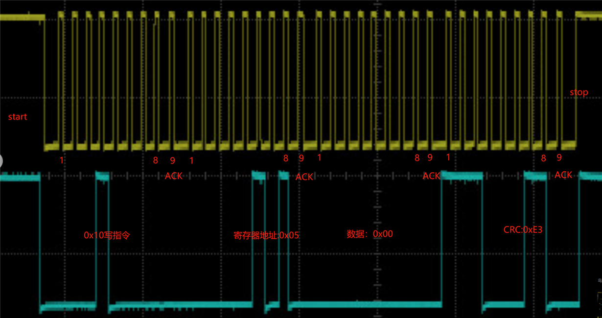写寄存器0x05,数据为0x00时序如下图,全程有ACK应答,时序没有问题
