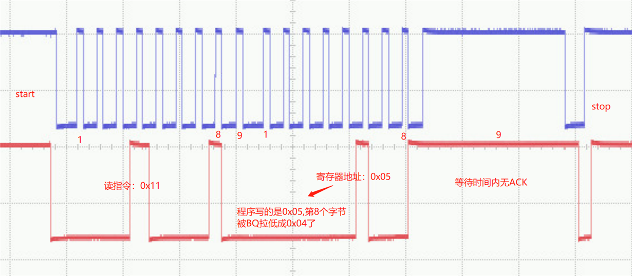 然后是读,读的时候,读指令有ACK反馈,但是我本来是要读0x05地址的,被BQ拉低SDA改变,而且无ACK应答,按理来说,我写都对了,读的话,时序不应该有错,如下图及代码,代码是简单测试代码,只发送读指令及寄存器地址