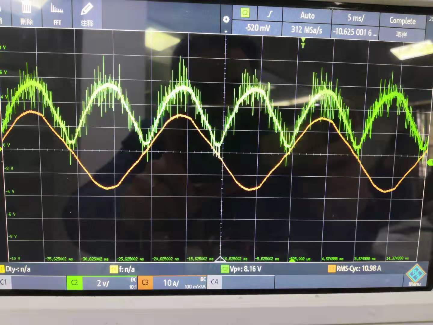 当负载低于1100W时,电源有噪音,正弦波电流的最大值附近出现毛刺尖峰,负载越小毛刺越频繁,噪音越大。