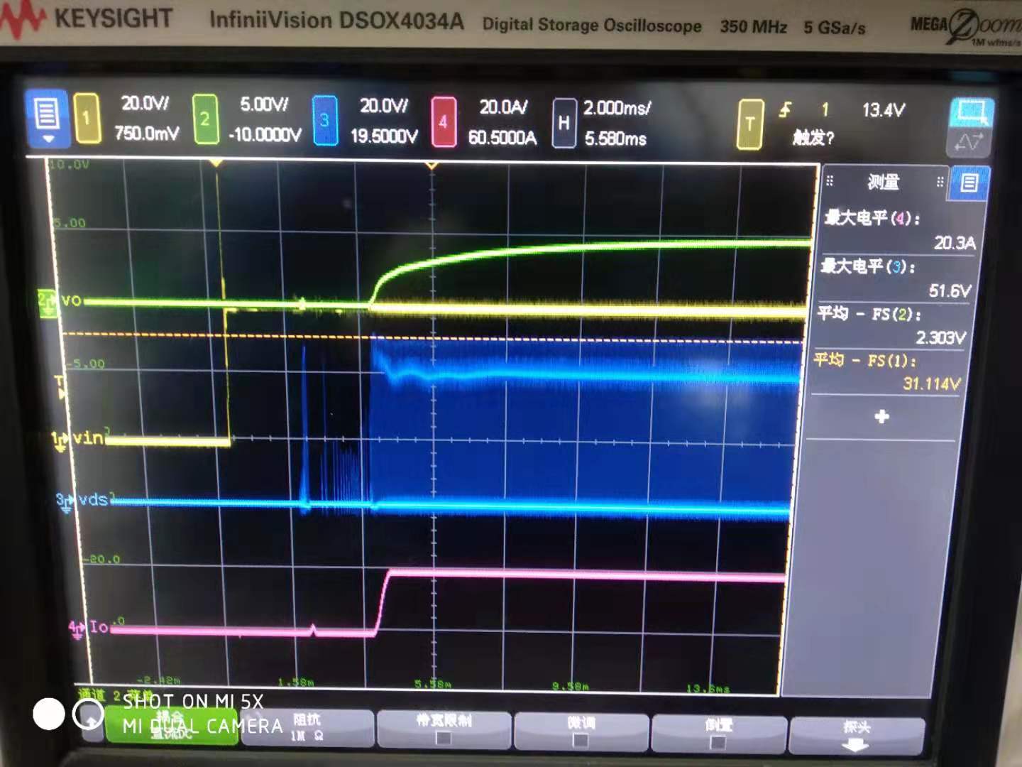 黄色是输入电压Vin波形,绿色是输出电压Vo波形,紫色是输出电流Io波形,蓝色是次级整流MOS管DS端波形。