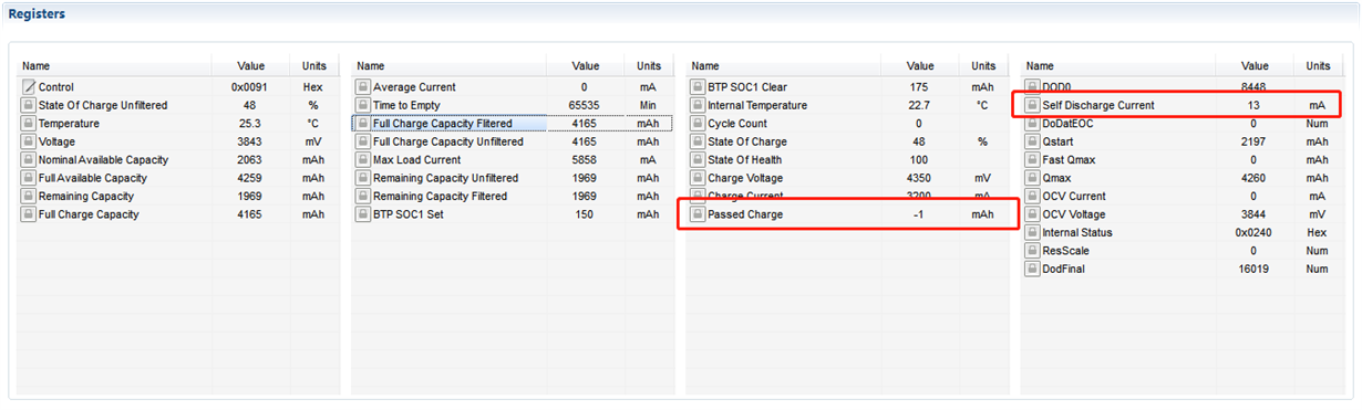 使用BQ27542做项目时self discharge current 和 passed charge有异常,原本这个数据是0的。放置一段时间后这两个数据就会有数值。数据是做过golden image的