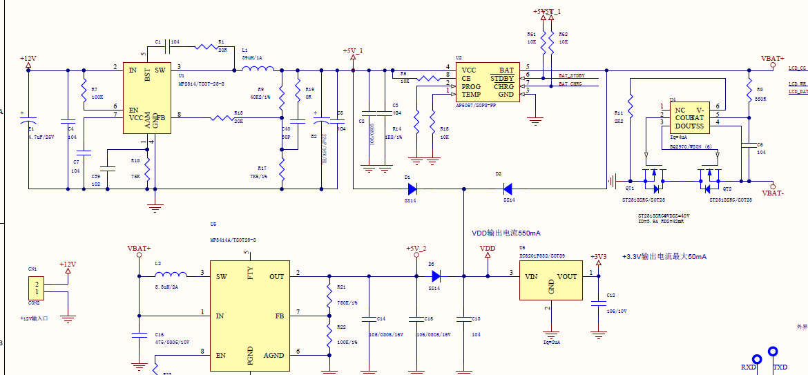1.不接入+12V的情况下,单独接一个电池在VBAT+ VBAT-之间,电池电压为3.8V,MCU和液晶、蜂鸣器都有接上,测试到VDD和3V3无电压, QT1的G极和VBAT-之间的电压为2.8~3.0V,QT2的G极和VBAT-电压小于0.01V,将QT2的DS极短路,输出都正常,判断是QT2未导通。