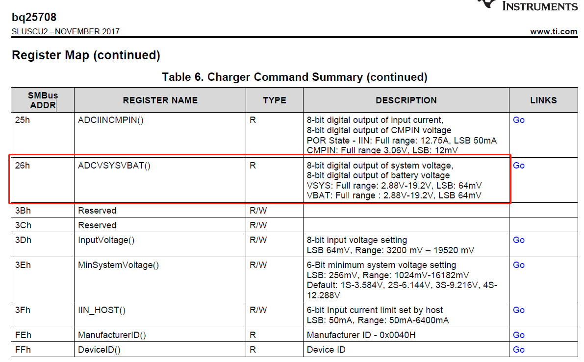 对于TI 的充电控制器芯片BQ25708的SMBUS寄存器表中有可读ADCVSYSVBAT()寄存器,