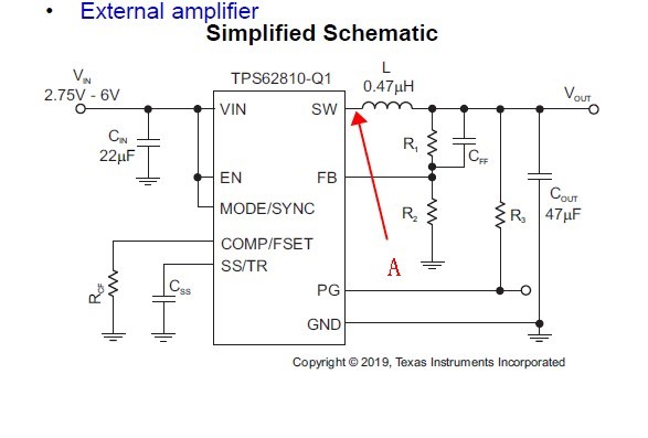 2.如下图所示,以TPS62810为例,通常而言,电感前端是类似正弦波形,如果输出5V电压,A点这里瞬间电压一般能达到多少?