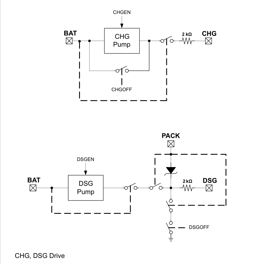 the chg and dsg pin are driven by a chg pump that will maintain the drive at 10V greater than the PACK voltage to provide FET turn on.At >3.1V, power input switches from VCC to BAT for the gauge.