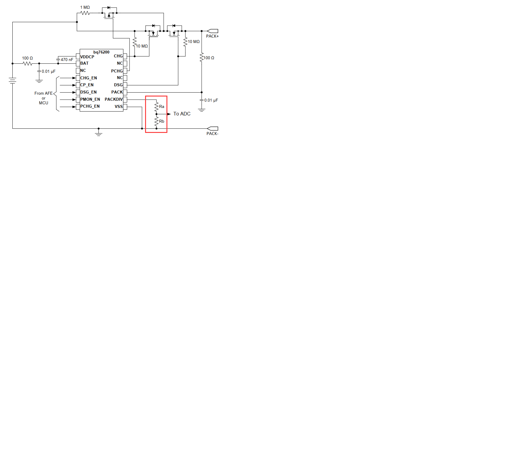 HI ALL,请问BQ76200实际应用中,PACKDIV计算公式是怎样的,AD采集值是Vpack/(Ra+Rb)*Rb吗,软件需不需要进行优化,比如RC滤波部分约有0.5V压差是吗,还有请教一下基于此项功能的充放电流程该怎么做呢,我看到你们关于"精确监测和 50μA 待机电流、13S、48V 锂离子电池组参考设计‘’有提到这一流程,链接如下http://www.ti.com.cn/tool/cn/TIDA-010030#technicaldocuments 策略可以提供参考吗,谢谢解答!