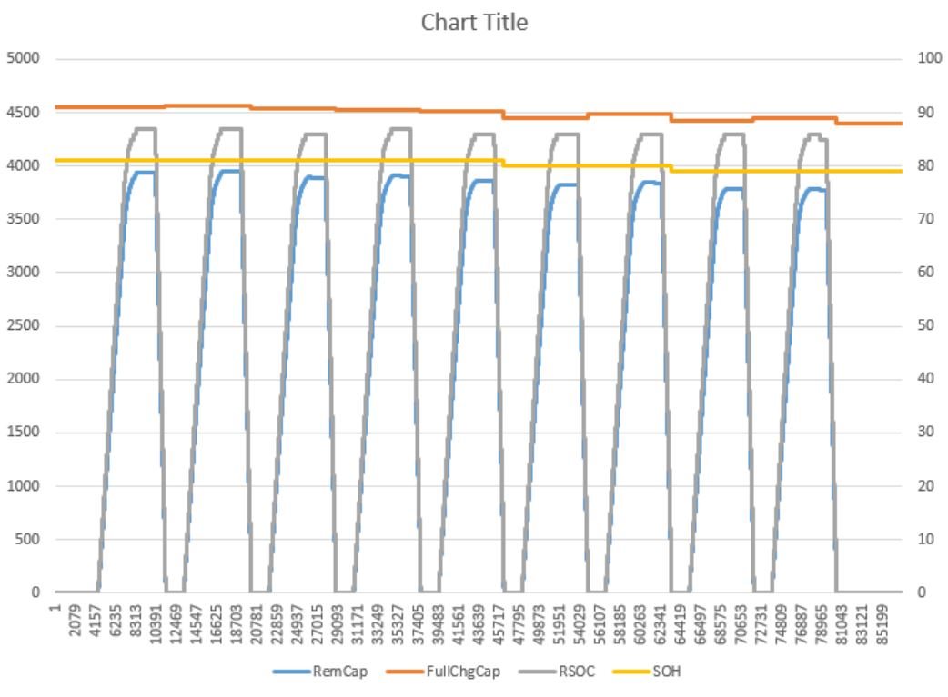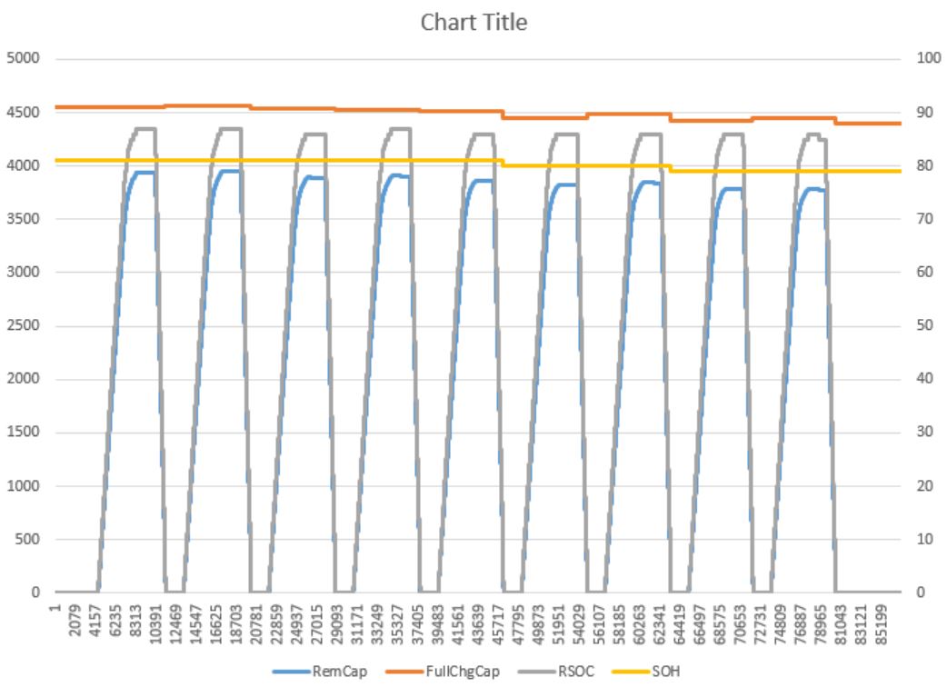 还是在循环测试当中,经过若干个周期以后,Remaining capacity在充电结束后始终达不到FCC更新的值,后者始终大于前者很多,导致在整个过程中, RSOC永远达不到100%,电池无法显示充满状态。甚至在二十几个周期后,最大RSOC只有85%以后。 这在实际应用当中是不允许的。是哪里设置的问题吗?需要怎么优化。