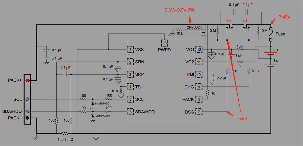 如图,两串电芯组电压为7.45V,充电MOSFET关闭,放电MOSFET导通。P+输出端为9.3~9.9摆动,放电MOSFET的驱动脚为16.8V。