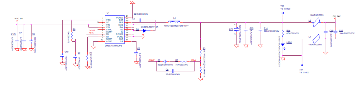 LM5576MH/NOPB 硬件设计为24V/2A输出; 输入电压范围40vdc-60vdc(由16节锂电池供电)
