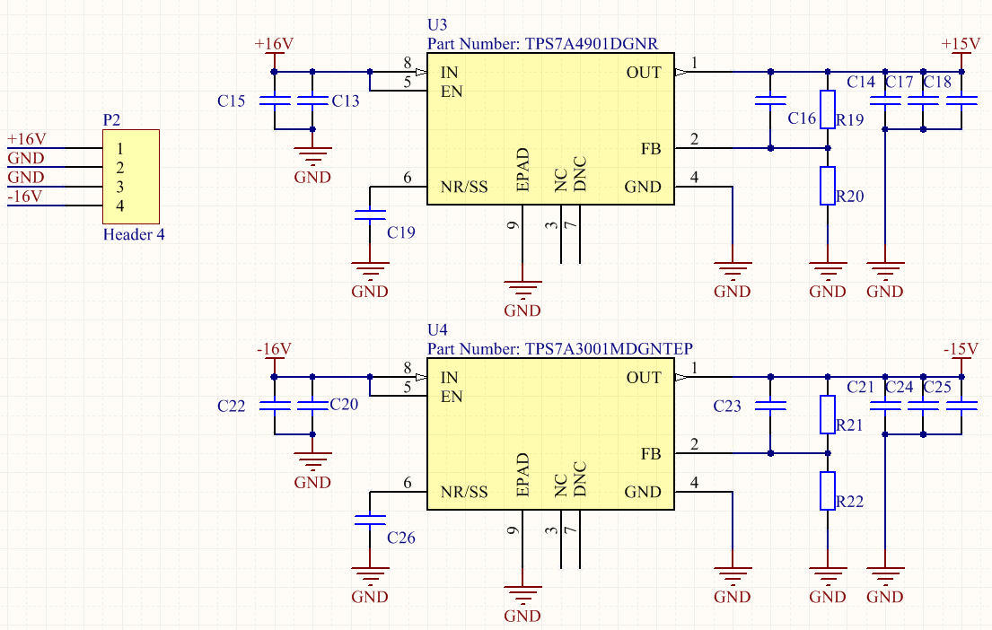 这为输入(上)和输出(下)的纹波测试结果,请忽略相移(因为不是同时测的)。输入为开关电源产生的±17V电压,纹波大可以理解,但输出纹波为什么会这么大呢?从结果看,这两个LDO几乎没有抑制电源纹波。