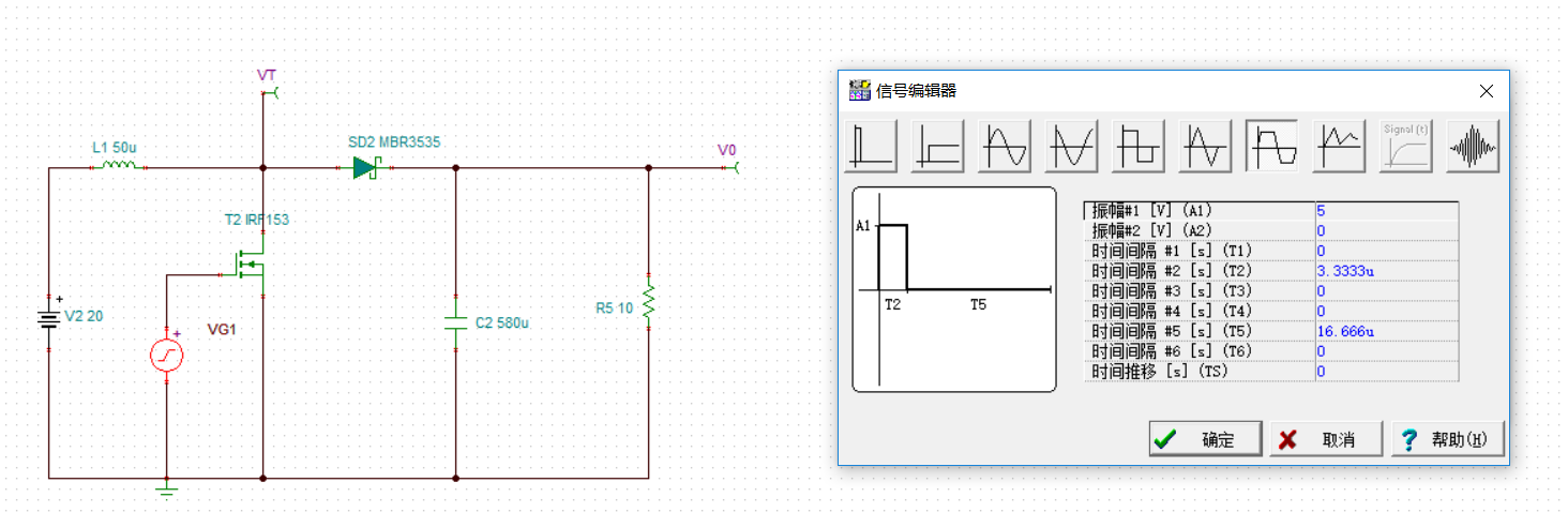 我通过对要求指标的计算,设置了如下的电路和信号,但不知道为什么这个电路出现错误,无法完成升压的任务。作为初学者还不太熟悉软件以及各方面的操作,希望得到大家的帮助,感谢!