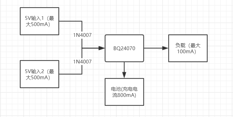 如图,两个输入5V电源最大输出电流500mA,两者各通过二极管再通过BQ24070给电池充电,同时给负载供电。