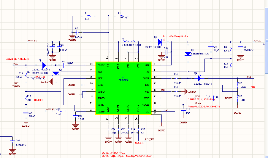 最近使用TPS65150进行一个VS=10V,VGH=15V,VGL=-9V,Vcom=0V的电压输出,按照datasheet的推荐电路进行设计,遇到VGH无正常电压输出的问题,只有约0.4V,具体现象如下