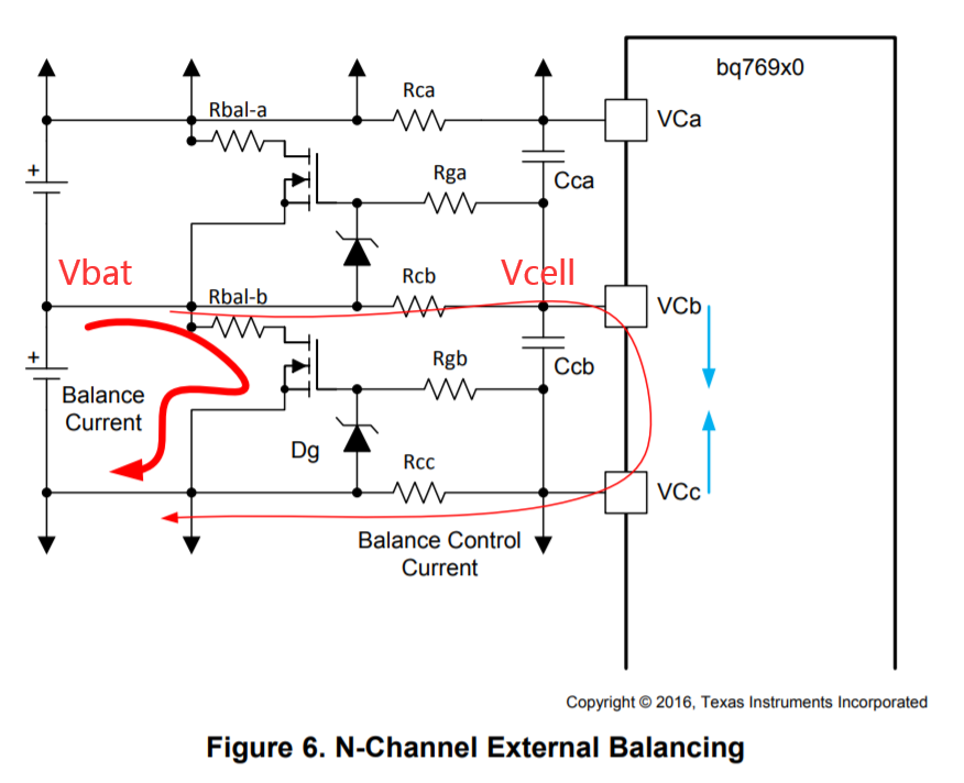 如图,正常情况下Vbat和Vcell电压应该是接近一致的,但是电池电压波动较大的时候,会出现两边电压不一致导致Rc电阻上产生压降,造成均衡MOS误动作,最后直接影响到采样的准确性。
