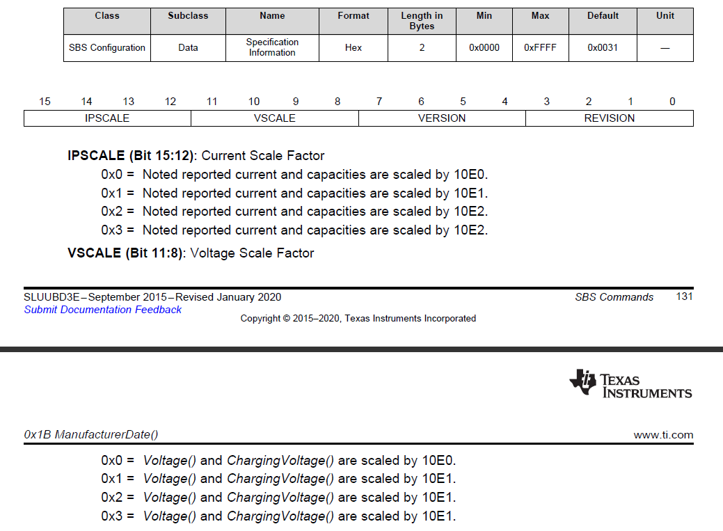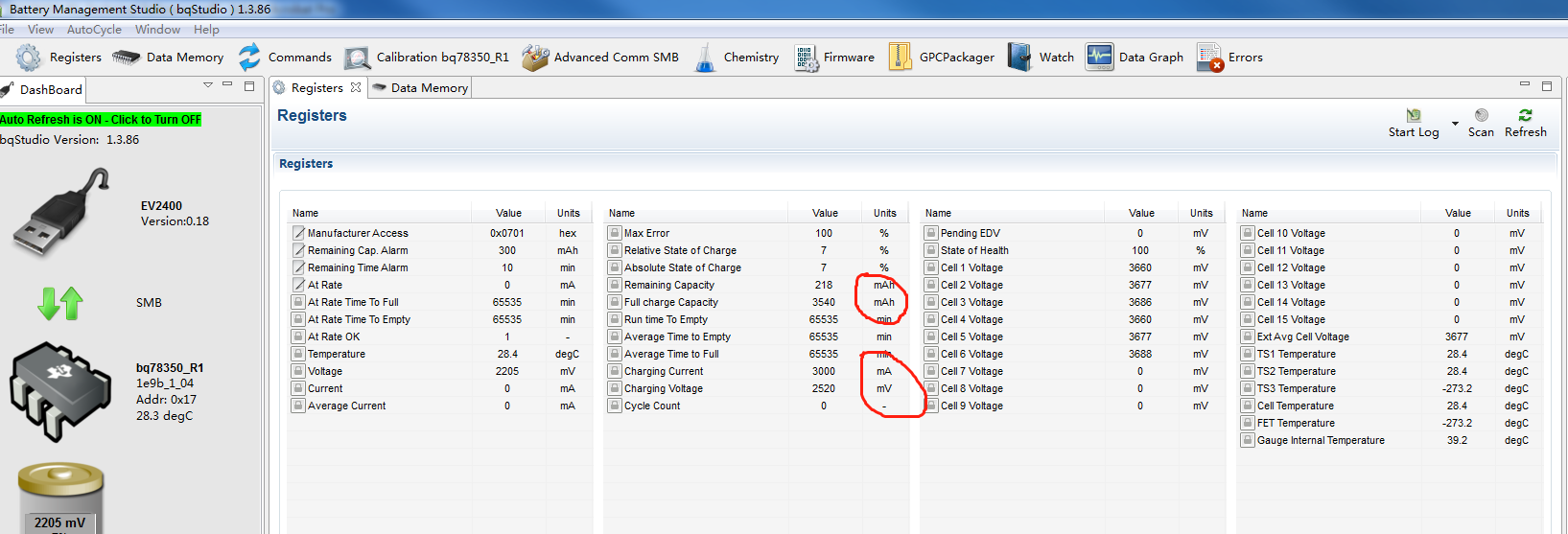 我的电池包规格是35.4Ah 电压22V,6串。用EV2400进入BQSTUDIO配置界面,Fuel Gauging / Design / Design Capacity mAh 最大只能设置到32767mAh,Design Voltage最大只能到5000mV,还有在Charge Algorithm / Fast charging / Voltage我设置为4200mv,但是Registers页面charging Voltage是2520mv(6串)。按照说明书我对这些值都进行了缩放10倍,reset之后,Registers页面charging Voltage和Full charge Capacity单位还是mv或者mAh,不是应该显示10mv或者10mah吗?