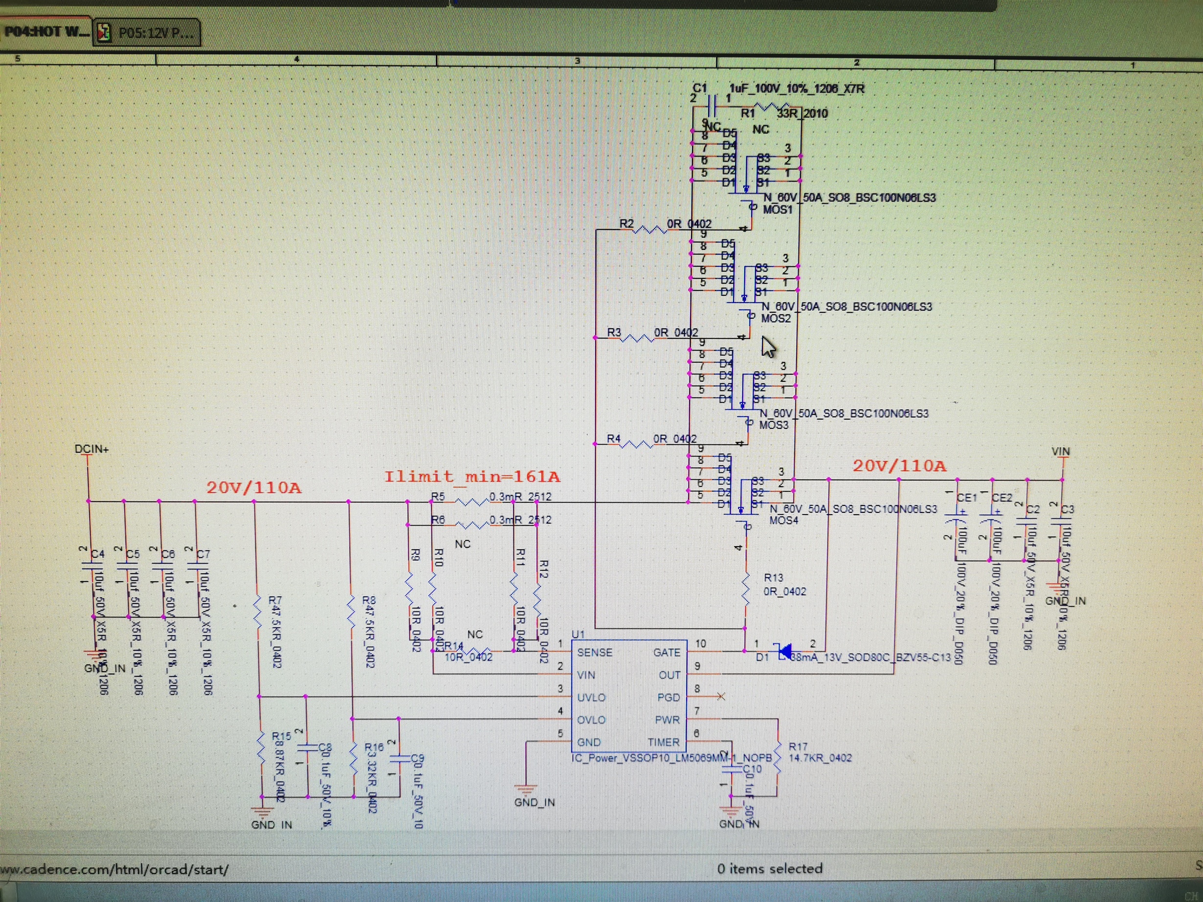 LM5069后面挂了几个DC-DC电源模块,一上电LM5069外挂的四个MOS烧掉,四个MOS的GDS基本都是短路,试着把R17电阻(Rpwr)调为28K,并没有改善。输入范围20V~36V,LM5069后端总的容性负载大约在4400uF,后端满功率为2000W