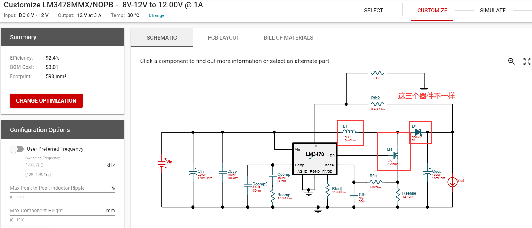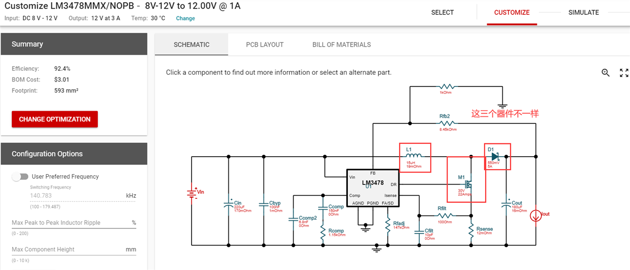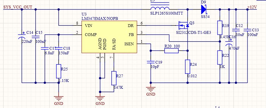 用LM3478输出12V电压电流设计的是最大3A,现在测试发现输出的纹波比较大,我输入的电压是10V左右,输出暂时没有负载,但是用示波器看波形发现纹波挺大的,我尝试增大电感不起作用,电路原理图是用TI官网的Power Designer工具生成的,电容电阻的选择基本按照生成的原理图来的,元器件不是完全按照推荐的型号。请问一下这个问题如何解决呢?